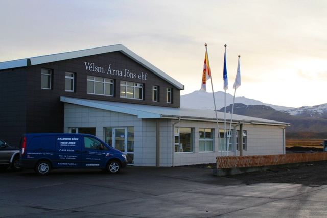 Hús Vélsmiðju Árna Jóns ehf. í forgrunni með Snæfellsjökul í bakgrunni.